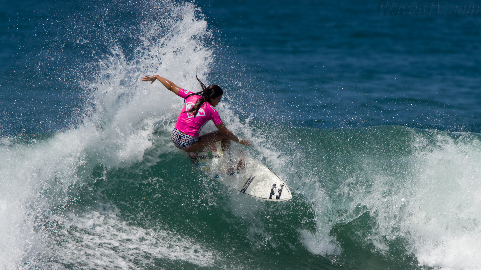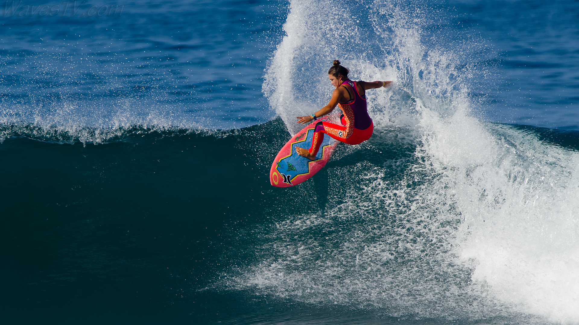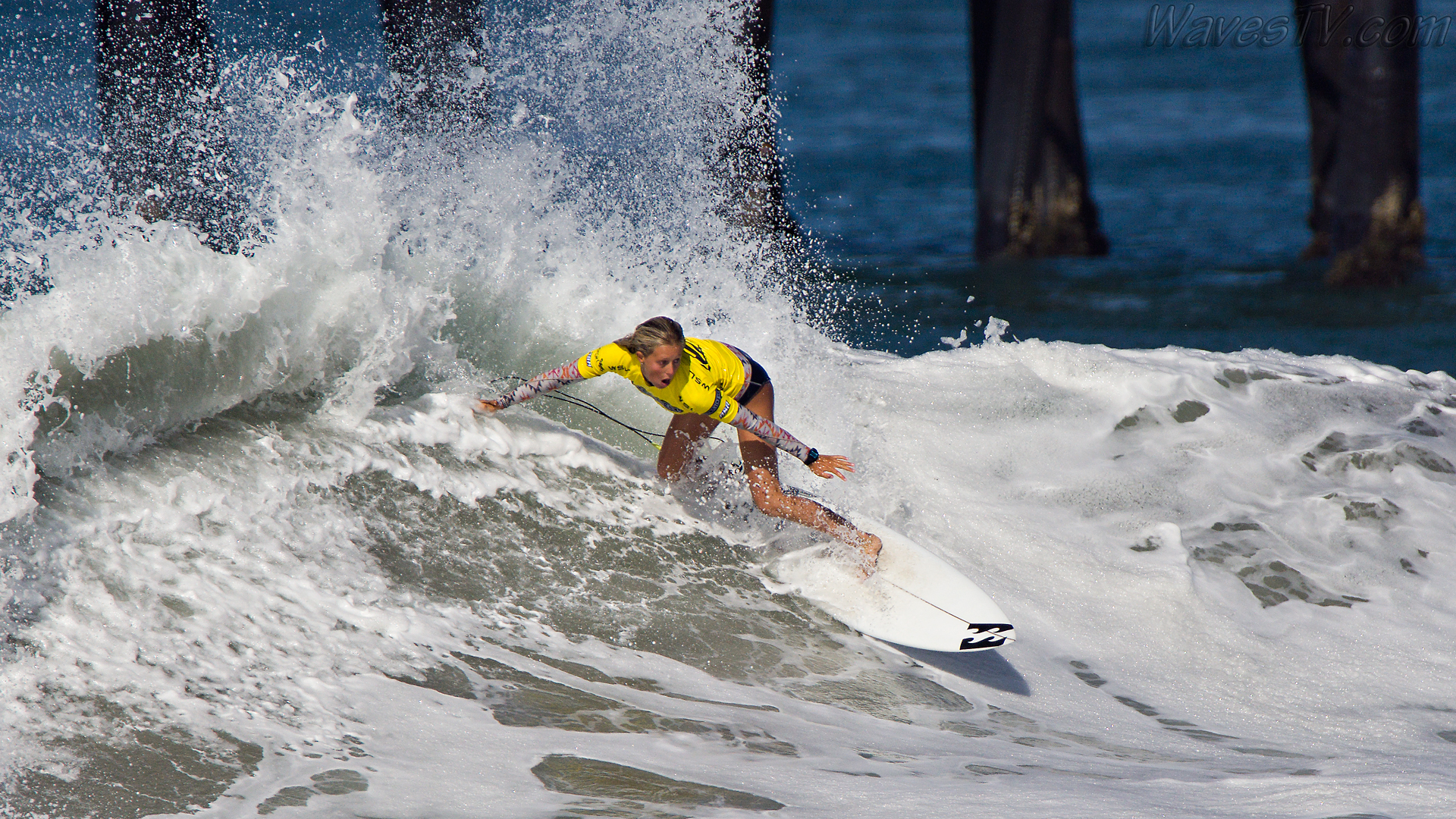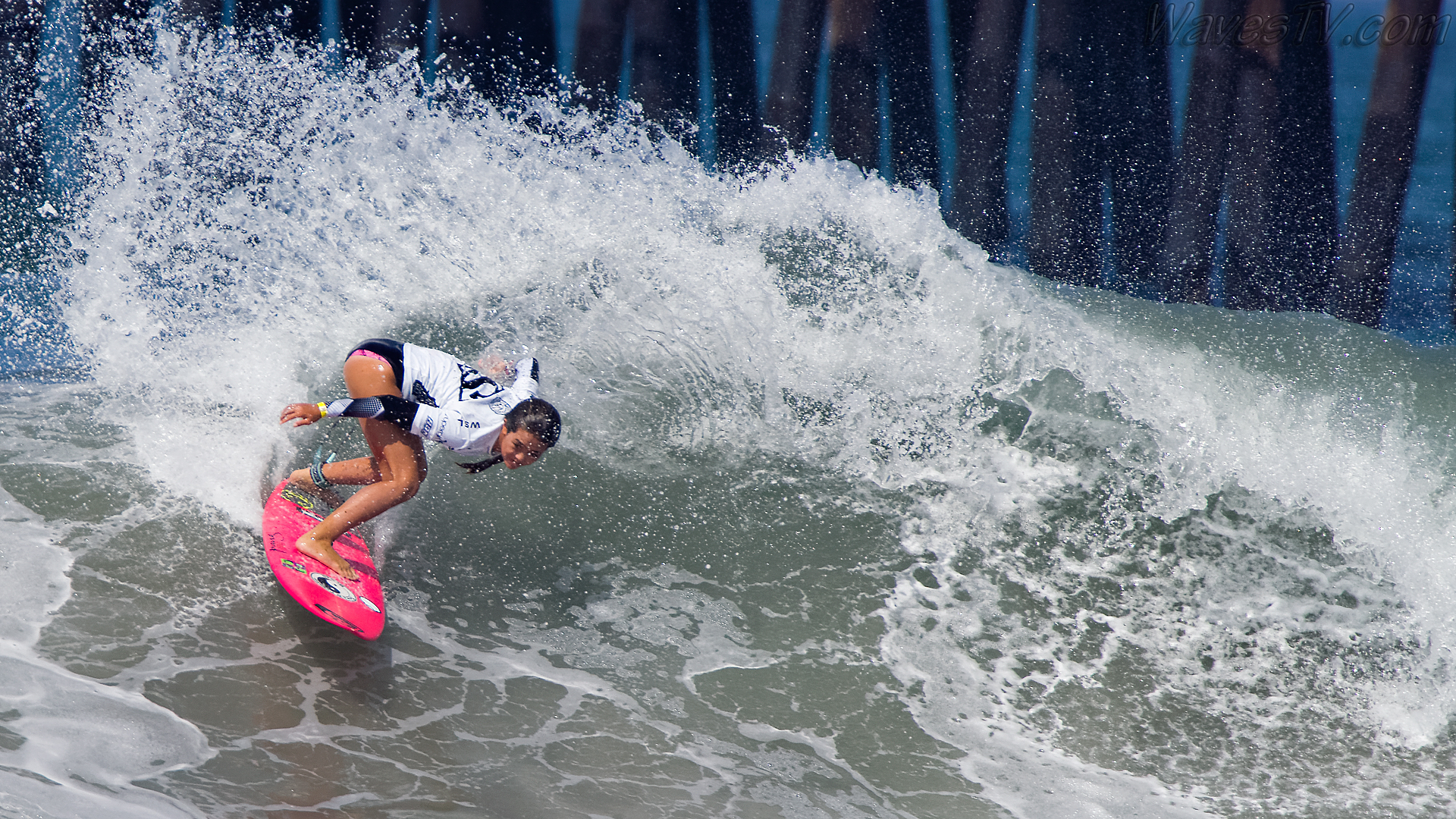 Coco Ho was the winner of the 2016 SuperGirl Pro, working her way through four heats on the last day, including the final round against Malia Manuel. The SuperGirl Pro is a qualifying event for the World Surf League competition, and by virtue of her final round appearance in the SuperGirl Pro, Malia went to first place in the Womens QS point standings. Laura Enever and Carissa Moore went down in the semi-final rounds. Biggest air of the day award went to Courtney Conlogue, as seen in the surf photo below.